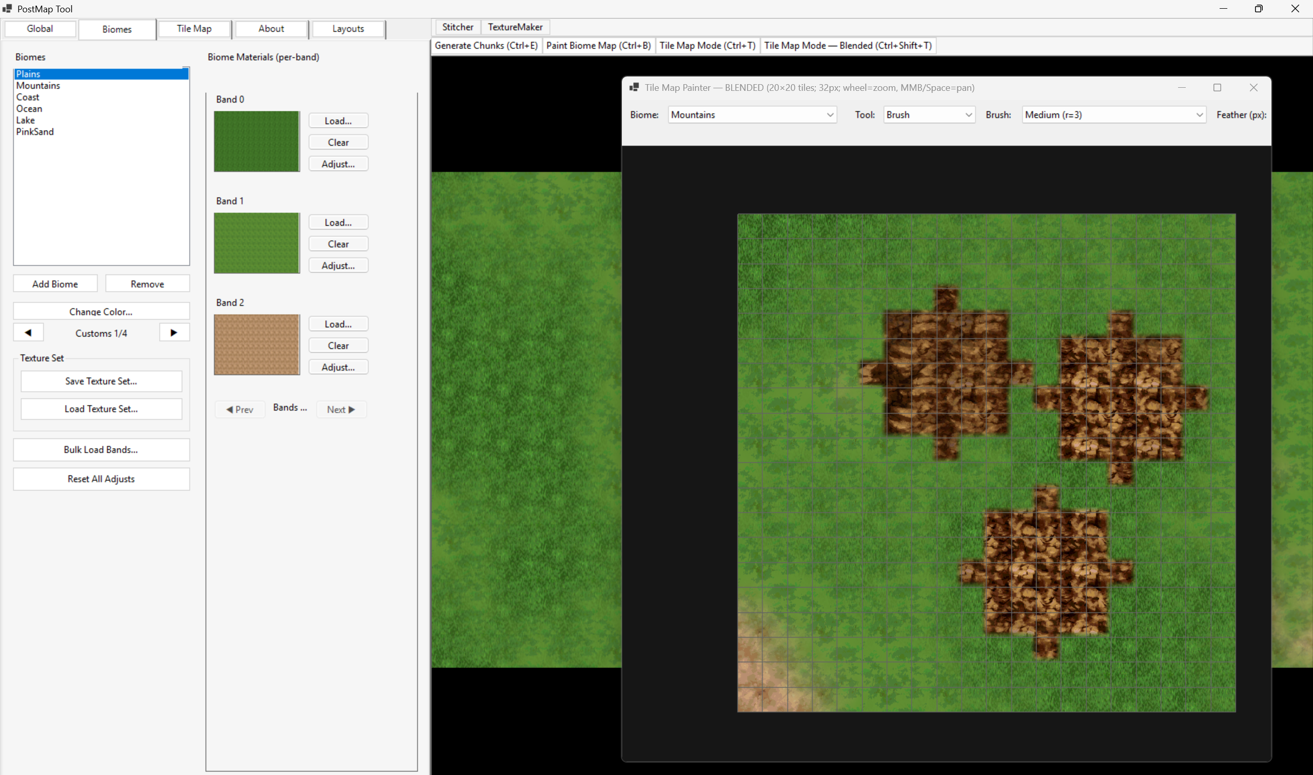 Post Map works as the texture builder ,and combiner. Each material or tile set built can also have there biome data saved to help work with generation for Doge Tile Map Editor. It has a few features such as Tile Map Builder ,Island Generation ,Material creator ,and Map combiner. You can create small materials or maps or generate huge areas and terrains!