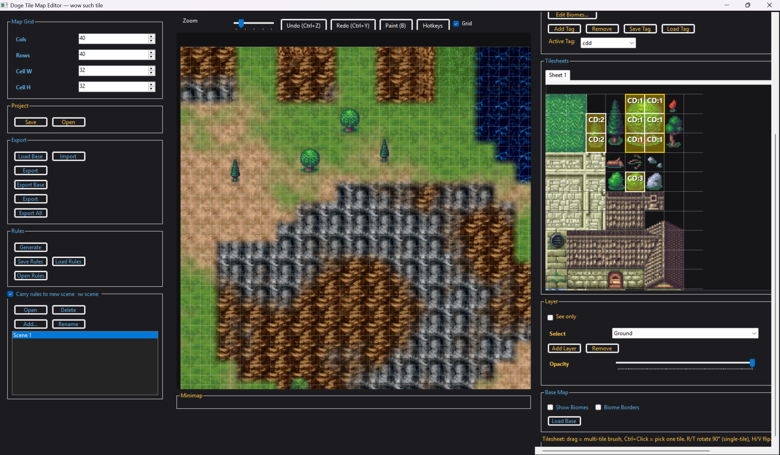 Doge Tile Editor works in sync with Post Map. You can place down tile sheet items. Use tags for in editor generation / placement with a rule system. Quickly separate out your tile sheets into many different assets. Or Bring everything into unity with a level builder with prefabs with separation of tile placements ,and the map itself! This gives the ability to actually consider these placements as actual objects in game rather then just a texture over a map so more code things can be done!